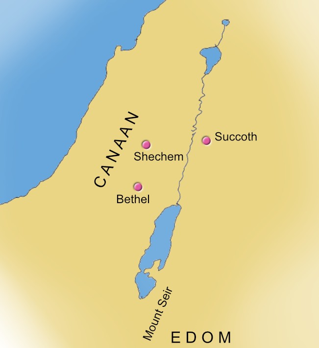 Jacob was immensely relieved to see Esau departing to his base at Mount Seir, south of the Dead Sea. Even though the present he had given his brother had cost him dearly, he felt it was a small sacrifice to be rid of his company. Furthermore, he had no intention of following Esau home, in spite of his brother’s polite invitation. Instead, he stopped at Succoth, east of Jordan, built himself a house, and settled there with his flocks.