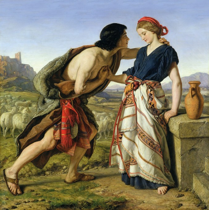 In real life, love at first sight is rare. But with Jacob, it was a classic case. He had just completed a 400-mile (600 km) pilgrimage to Haran, the city where his mother was born. Tired, lonely, but excited at the prospect of meeting his relatives for the first time, he stood near the public well waiting to ask someone the way to his uncle’s house. At that moment a beautiful shepherd girl approached, bringing her flock to be watered. At once Jacob sprang into action, rolling away the great stone that covered the well and filling up the troughs for her animals to drink. Before long he was deep in conversation with the blushing shepherdess, who, to their mutual surprise, turned out to be his cousin. He was escorted home, and introduced to the family, who were glad to hear news of their relatives down south. But Jacob had eyes only for Rachel, the girl he met at the well. The romance between them is one of the tenderest, and yet the most tragic, in the whole Bible story. It began with a courtship that lasted a daunting seven years, and left Jacob penniless.
