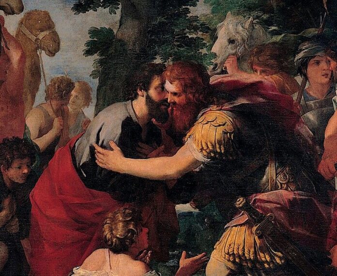Jacob sent messengers ahead to inform his twin that he was on the way, and meanwhile continued slowly southwards. To his consternation, his servants returned with the news that Esau was coming to meet him, with four hundred men (32:6). Jacob immediately feared the worst. Undoubtedly, he argued, Esau was bent on revenge—he must have been nursing his anger all these years, and would soon be upon them, tearing Jacob’s little band into pieces in a bloody slaughter.